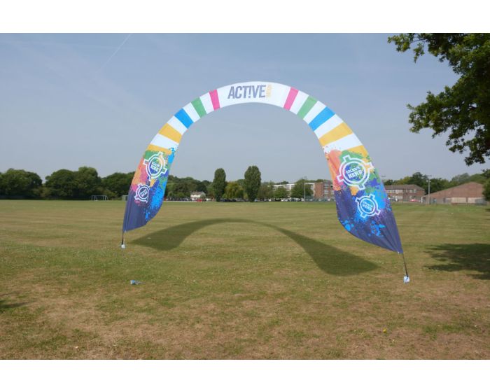 Printed race arches make an impressive display, they are large and create and effective gate, ideal for start/finish lines. They are more cost effective than inflatable arches and do not need a power source to keep them on display. Interchangeable banners also mean that you are able to change your designs and promotional messages. All of our printed race arch banners are produced in house at our head office in Cambridgeshire, making sure they are always high quality.