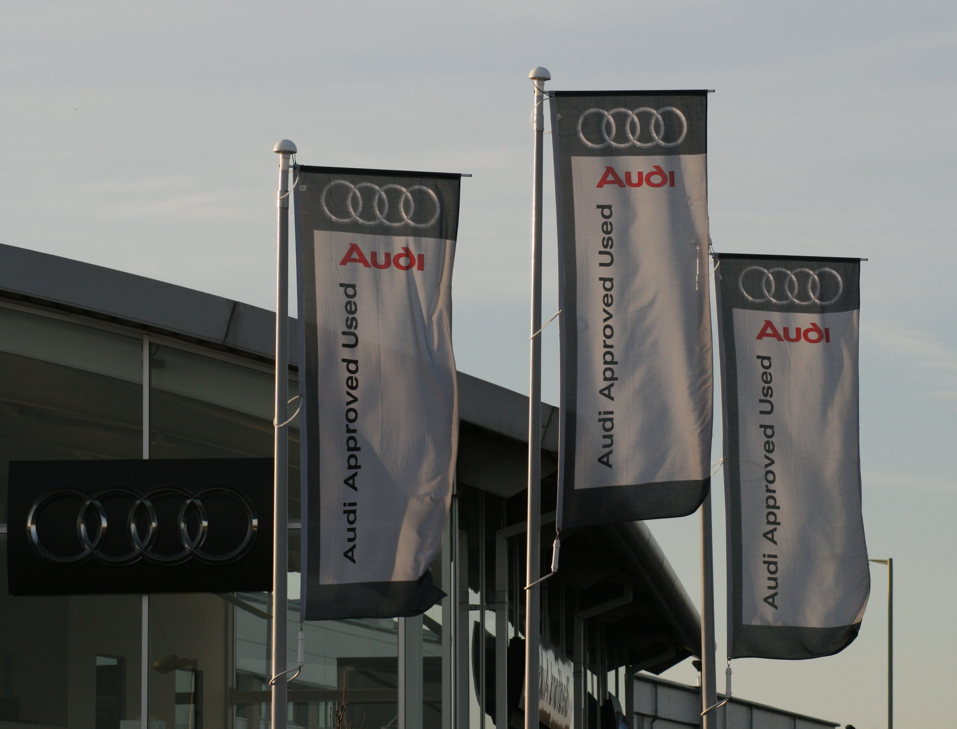 Custom flags are the ideal way to promote your brand. We can produce any size or shape custom flag, matching your unique artwork. Our custom flags are ideal for using on forecourt flagpoles or our standard aluminium or GRP flagpoles, helping your business to stand out against the competition. Our standard custom flags are available in portrait and landscape shapes. Among our automotive customers the portrait flag is most popular, allowing them to display there logos and branding, creating a professional automotive promotional display.